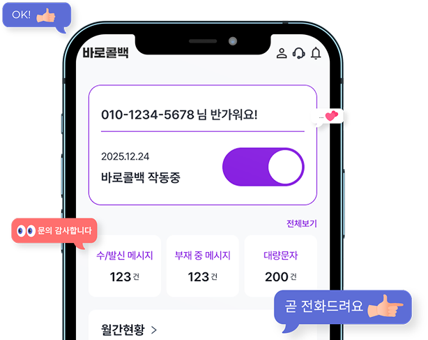 고객과 통화 종료 후 혹은 부재중 전화에 미리 설정한 메시지를 자동으로 발송해 주는 고객관리 필수 애플리케이션이 바로콜백입니다.
