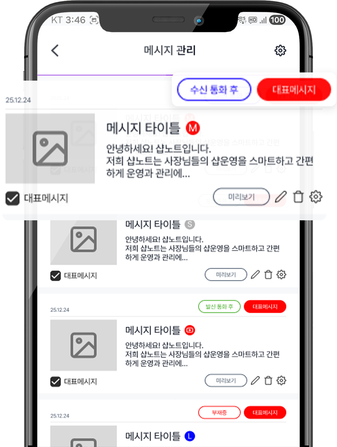 1. 메시지 관리 기능: 콜백 메시지 발송 상황 수/발신 통화 후 & 부재중에 필요한 메시지를 다양하게 작성 및 선택하여 발송할 수 있습니다.