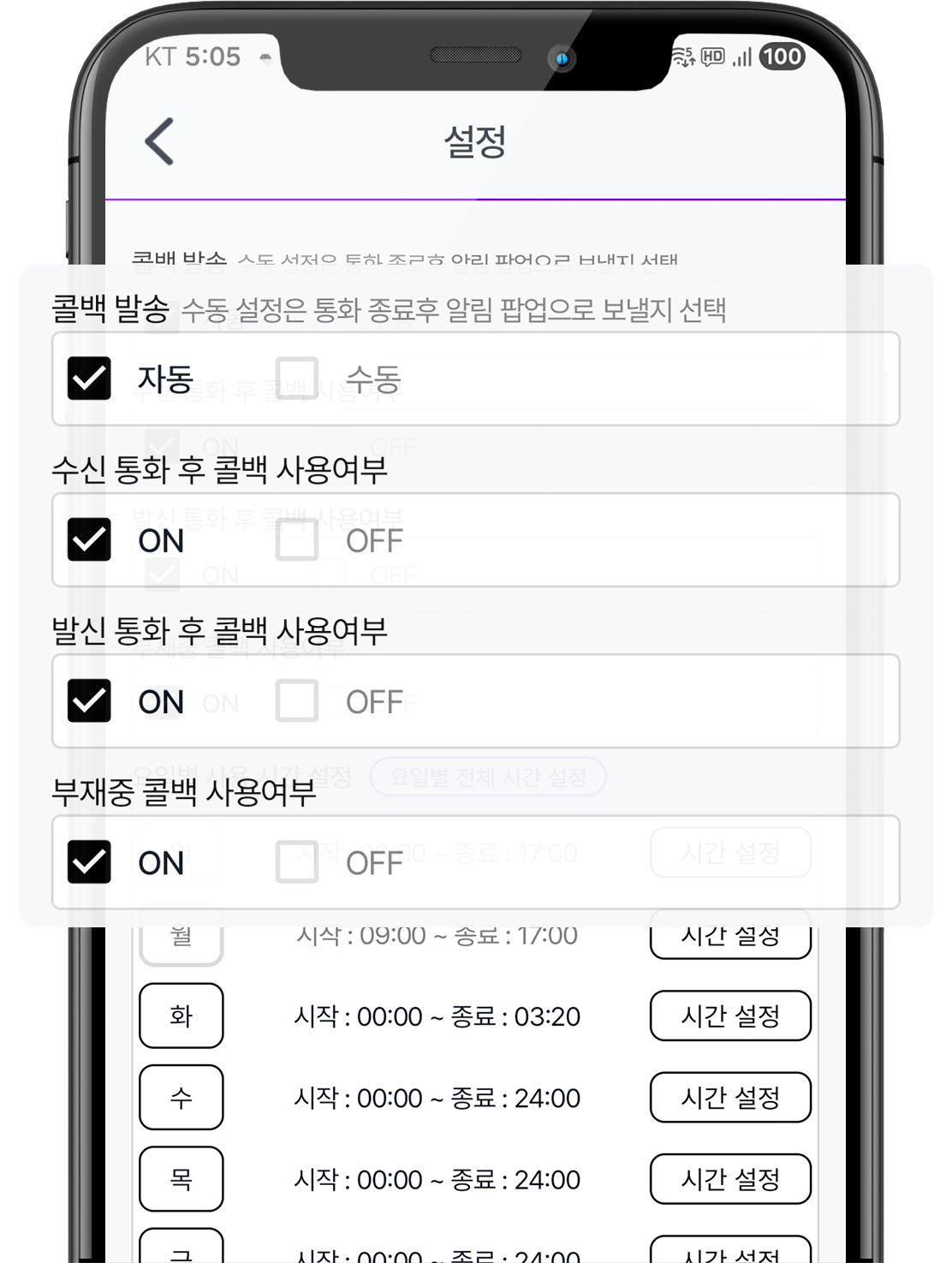 8. 설정: 바로콜백 사용부터 수/발신 통화, 콜백 메시지 발송 요일/시간 설정, 통화 중 대기 설정 방법, 일/월 메시지 발송 제한, 투 넘버 사용/미사용, 프로필 명함에 삽입될 길 안내 서비스 등록 등을 설정하고 관리할 수 있습니다.