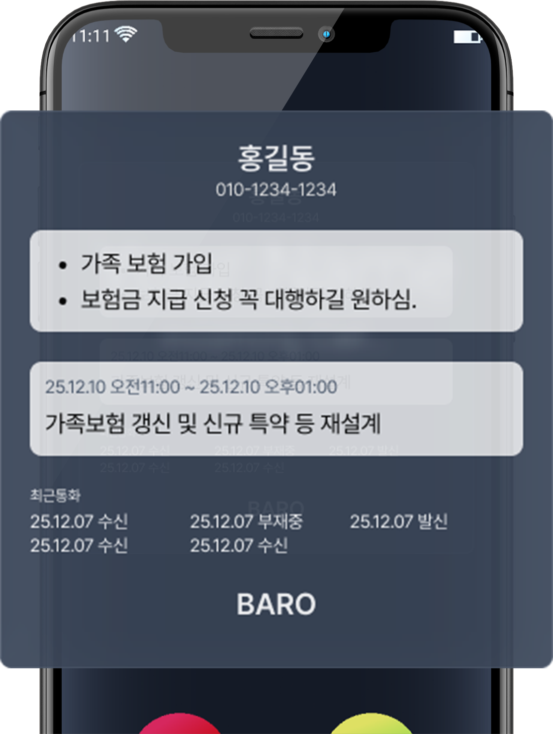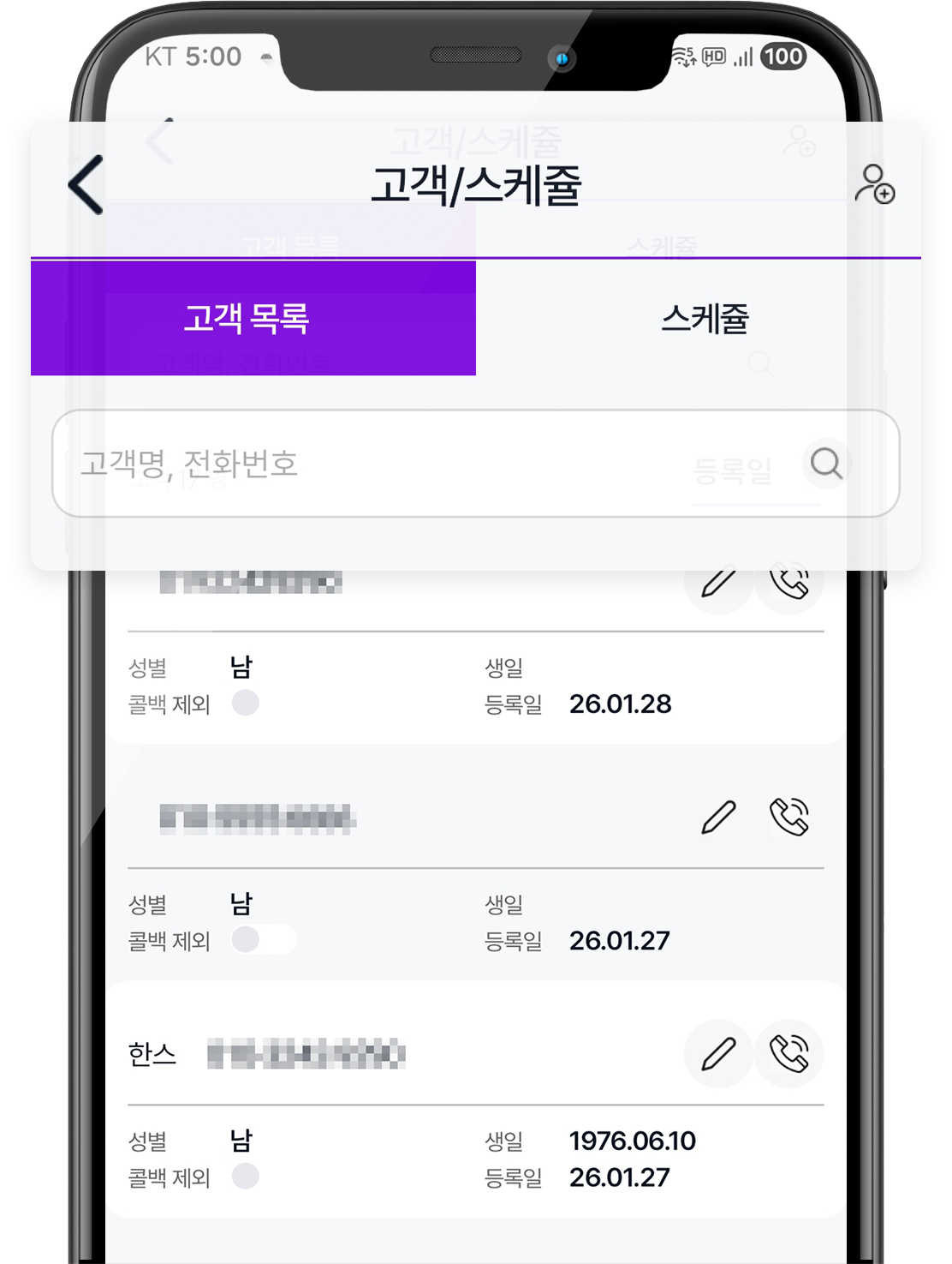 4. 고객/스케줄: 휴대폰의 연락처와는 별개로 ‘바로콜백’에 고객으로 등록해 문자 수신 거부, 스케줄 등록/관리, 최근 통화 이력 등 관리가 가능합니다.